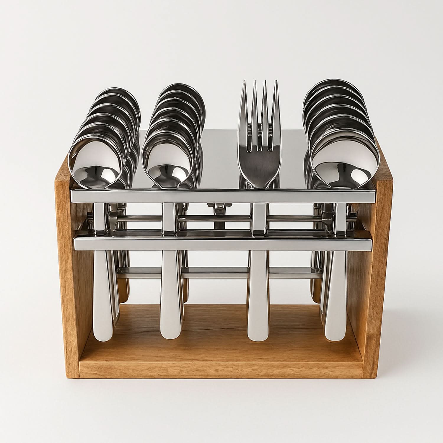 The vertical wooden rack allows neat storage of all cutlery pieces, keeping them clean, dry, and ready to use. -